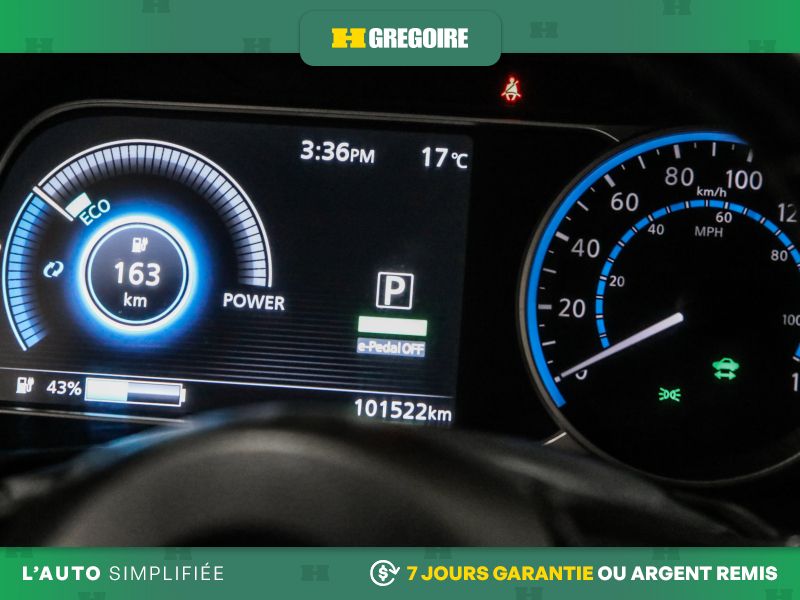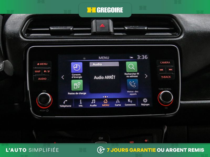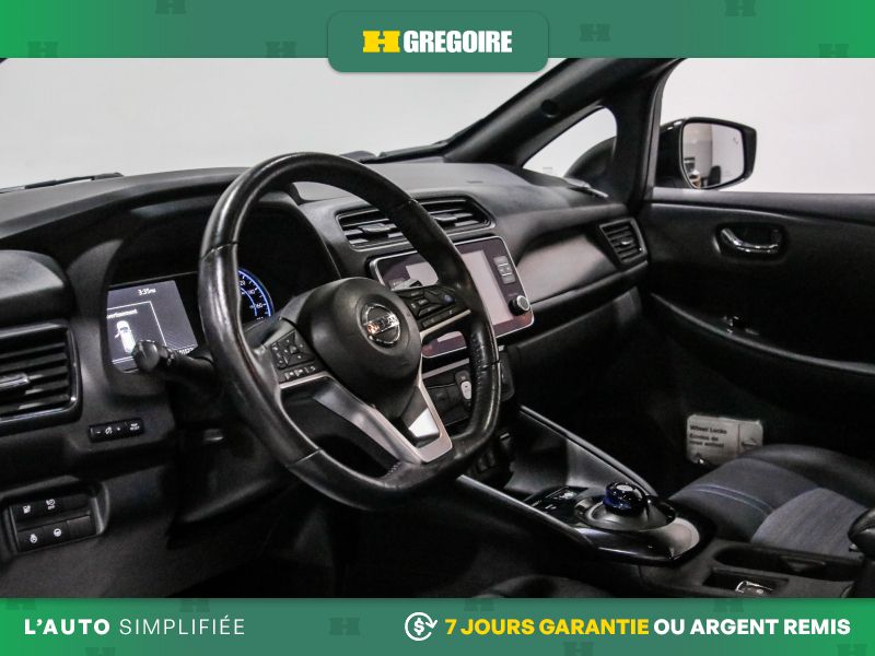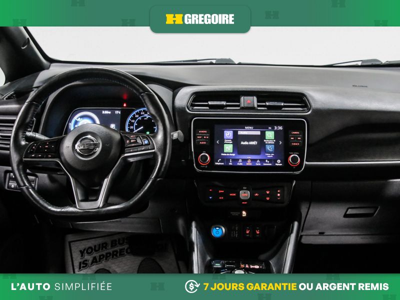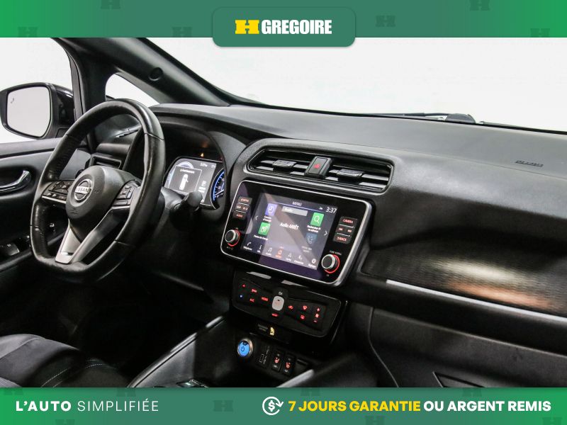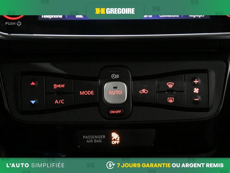 Services NissanConnect EV alimentés par SiriusXM -comprend : témoin d'état de charge de la batterie, lancement de la séquence de charge, mise en marche du système CVCA, alerte automatique en cas d'impact, appels d'urgence et repérage du véhicule en cas de vol, les téléservices comprennent verrouillage et déverrouillage des portes, et fonction d'activation du klaxon et d'allumage des feux, alertes personnalisables dont l'alerte de zone limite, de service voiturier, de couvre-feu et de limite de vitesse