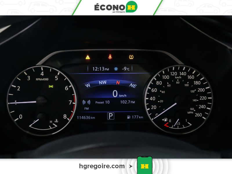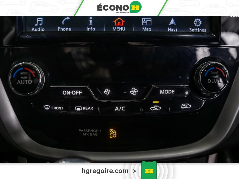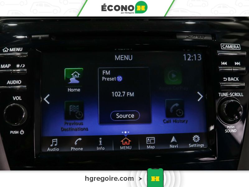 Radio : chaîne audio AM/FM/lecteur CD avec système de navigation -comprend : lecteur MP3/WMA, 6 haut-parleurs, prise d'entrée audio auxiliaire, radio par satellite SiriusXM, Apple CarPlay, Siri Eyes Free, écran couleur WVGA central de 7 po, ports USB avant et arrière pour interface avec iPod et autres appareils compatibles, système téléphonique mains libres Bluetooth, lecture audio en continu au moyen du système Bluetooth, messagerie texte mains libres, écran couleur de 8 po avec commande tactile multifonction, système de navigation Nissan, reconnaissance vocale Nissan pour fonctions audio et de navigation, et services SiriusXM Traffic